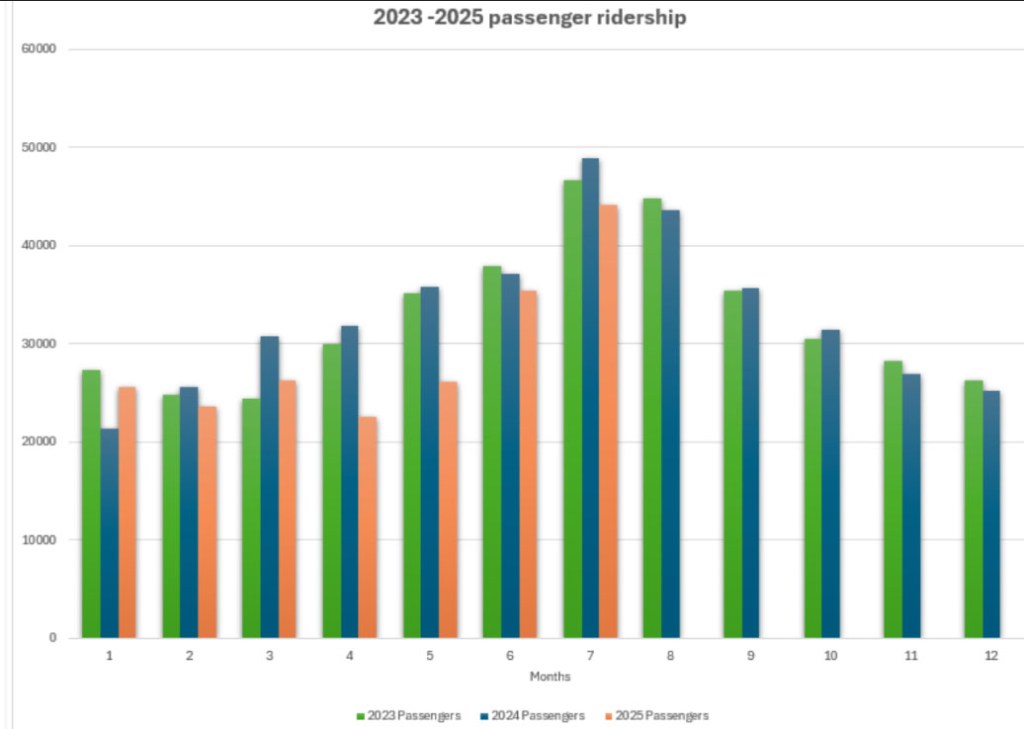 This real-world data highlights how fare changes correlate with vehicle and passenger ridership declines in headcounts throughout 2025, except in the months when service was suspended.